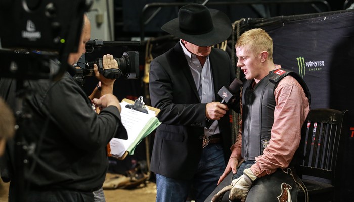 Brock Radford is interviewed by Jason Davidson in London, Ontario for TSN. PBR Canada photo by Covy Moore.