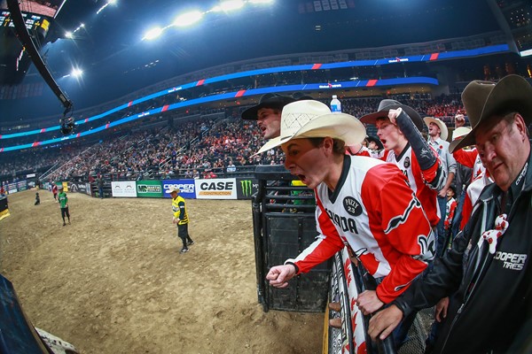 Dayton Johnston cheers on a fellow Team Canada member at the PBR Global Cup in Edmonton, Alberta. Photo by Covy Moore / CovyMoore.com