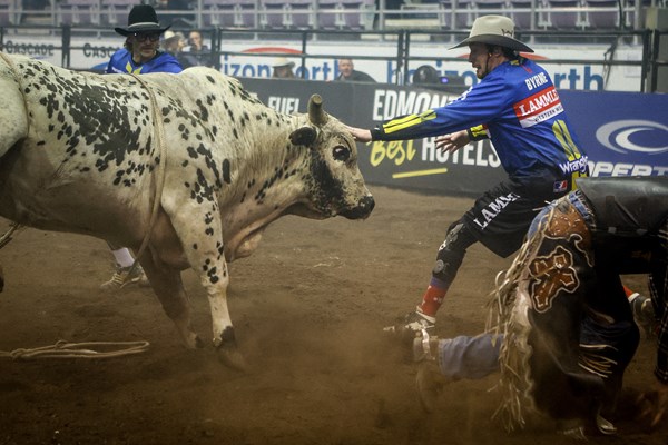 Nick Tetz is coming off a strong event in Las Vegas, stayed on for his team the Arizona Ridge Riders, but they didn’t make it through, so luckily for us we get to see him in Medicine Hat. This kid is a absolute superstar, rides them either way, up and down. This bull’s exact pattern is that. He might be to the right, might be to the left, but just good up-and-down, spinning either way. Look for Nick to knock this one out of the park, an 86-87-point ride to set himself up great for the championship round and try to win that next Canadian Championship.