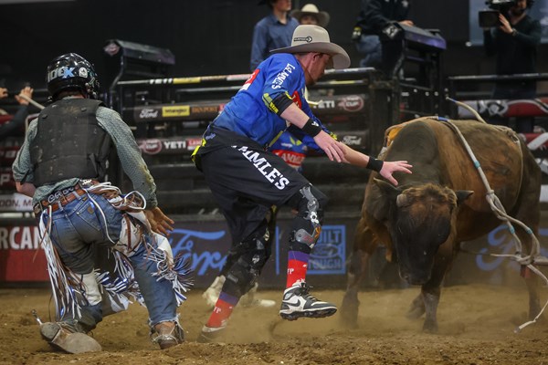This is a bull that’s been around for quite some time, we've seen him at the Finals. The guys love to get on him. He really blows in the air, should be around to the left into Weston’s hand. Has good timing, a little bit of suck back to him, but one that Weston's got to be happy to have drawn, one they win a lot of money, on when they win rounds on. He's always at the top of the picks. Look for Weston to capitalize here, an 86-87 to self himself up great for the rest of the event.