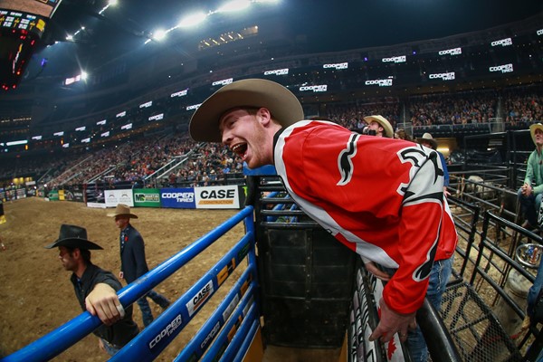 Tanner Byrne cheers on a teammate during the 2017 PBR Global Cup in Edmonton, Alberta, Canada. Photo by Covy Moore / CovyMoore.com