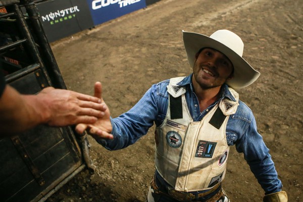 Cole Young catches a high-five after he competes in Ottawa, ON. PBR Canada photo by Covy Moore.