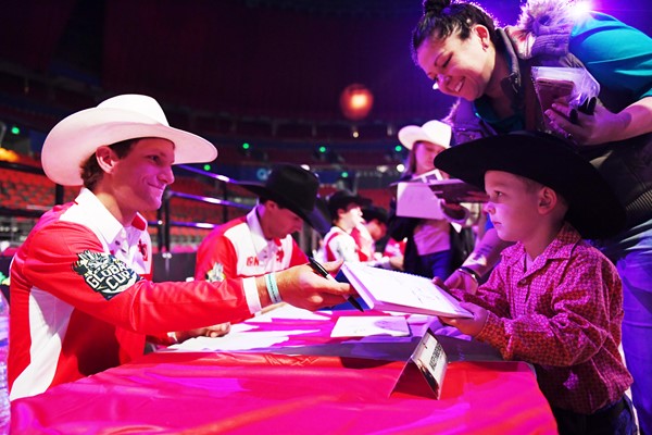 Wacey Finkbeiner signs an autograph at the PBR Global Cup in Sydney, Australia at Qudos Bank Arena.