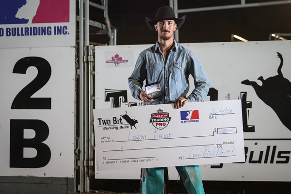 MAGRATH, Alta. – Backed by a flawless 2-for-2 performance in Magrath, Alberta, Thursday evening, Logan Biever (Claresholm, Alberta) won his second PBR (Professional Bull Riders) Canada Touring Pro Division event of the season, victorious at the Celebration for the Two Bit Nation.